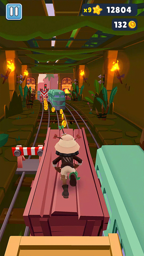 在地铁跑酷游戏中,刚开始玩家将会出现在地铁铁轨上,由于贪玩导致被暴躁的警卫和狗子的持续追捕,在奔跑的过程中,玩家会在沿途拾取金币、钥匙、道具等物品,同时需要躲避前方列车和其他物体的障碍,还可以跳上列车顶部,使用滑板来躲避抓捕,直到玩家撞上障碍物,或者被列车撞到,被警卫抓住,游戏就会结束,可玩性极强。