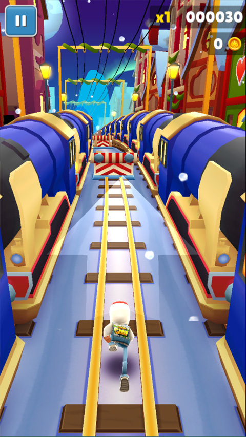 1、在地铁跑酷国际服圣诞节正版游戏中,当前方有障碍物时,向上或是下躲避