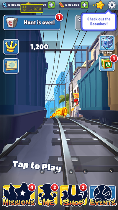 3、一次性道具需要手动激活,气垫滑板可使角色在一定时间内成为无敌状态,不会受到任何伤害影响。开启神秘宝箱可随机获得道具、金币或其他物品,建议玩家在资金充裕的情况下开启宝箱。抢跑道具可让玩家在游戏开始前抢先触发,这样便可获得较多积分。当你感觉某项任务难度太大,无法完成时,可以购买道具跳过该任务,不过小编建议玩家尽量不要使用该道具,因为任务系统是地铁跑酷十分重要的环节。
