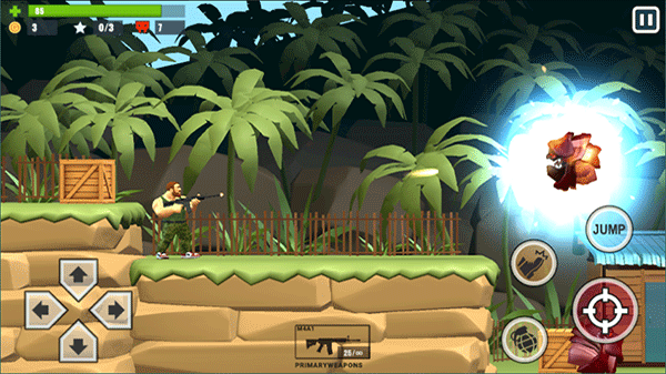 1、进入到游戏后左边的轮盘控制角色移动,右边的按钮分别控制跳跃、踢打、丢手雷和射击;