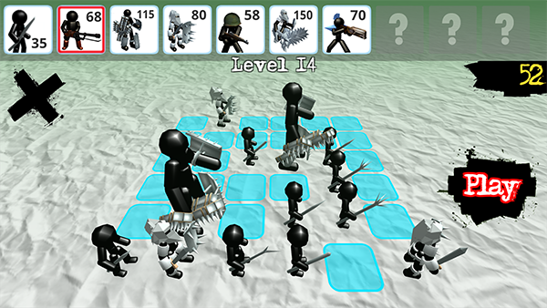2、玩家选定上方要购买的火柴人之后,点击下方蓝色框框即可上阵火柴人,摆好阵型点击play即可开始游戏,如果觉得阵型不好,玩家可以点击左上角的X,重新摆阵,当然也是需要尽量把远程兵放到后排,并且用近战兵将他们包围起来,保护好主力输出。