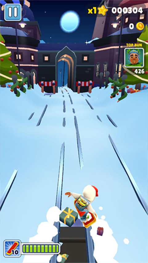 玩家可以在这座精心装扮的小镇,感受到满满的过节气氛!是的,为了迎接一年一度的圣诞节,不仅镇长耗费巨资摆设了许多应景饰品,甚至连我们熟悉的,那有着胖嘟嘟身材的警察也换上了圣诞老人的服装……而他最棒的伙伴当然也不会缺席,戴上麋鹿发箍的狗狗是不是更可爱了呢?玩家现在就发挥你灵活的手指,让我们的主角杰克,自由左右移动,上跳下滑的方式,避开重重障碍,尽情跑动享受这无比的风光吧!如果你是地铁跑酷真爱粉,那么这个地铁跑酷国际服圣彼得堡版本你绝对会喜欢!