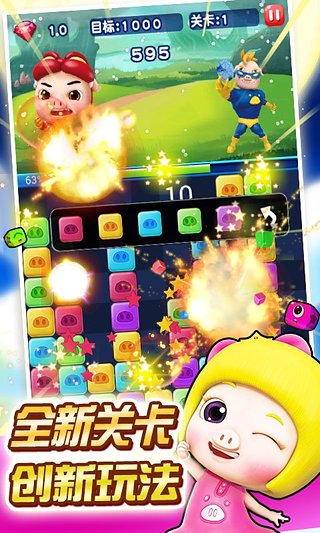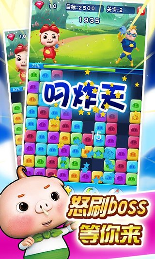 4、简单好玩的经典消除,人人都可以快速上手,快来加入可爱Q萌的猪猪侠战队,打倒反派BOSS,守护童话世界吧!