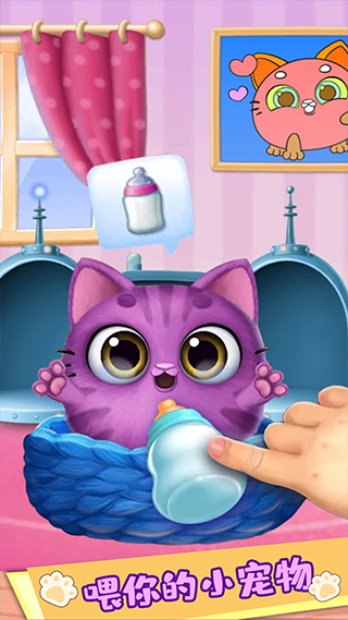 1、模拟养宠物过程,孩子可以在游戏中得到可爱的小狗与小猫并与其互动;