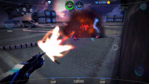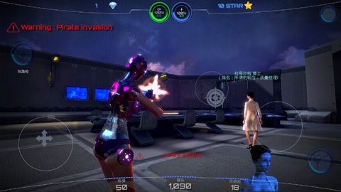 总体来说,与一般的枪战游戏相类似,无比浓重的科幻画风,极具代入感的情景营造是这款游戏的亮点所在,左侧遥感,右侧控制镜头和射击非常的中规中矩。左上方为爆裂弹,右下角按钮为近身攻击也为游戏在没有子弹时增加了生存能力,切勿被外星机器攻击,合理的掌控距离将所有的外星生物全部击杀。