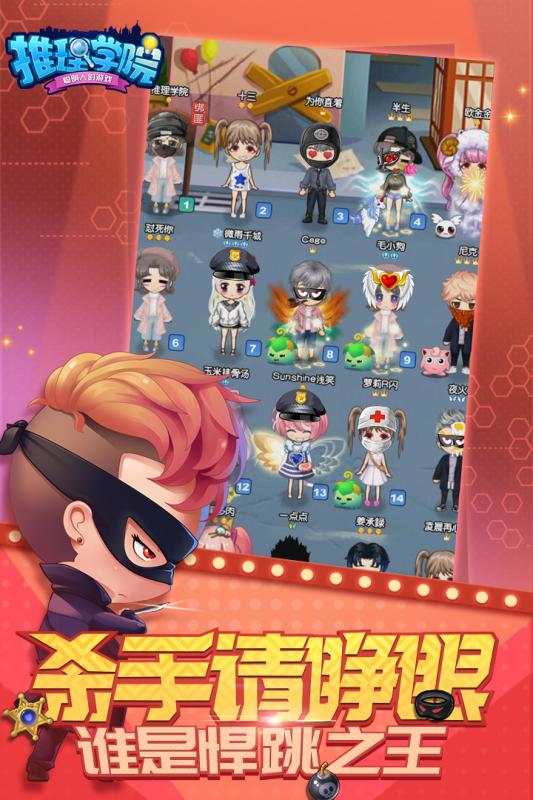 《推理学院》是一款二次元推理杀人桌游。多款经典桌游和互动小游戏让你和好友决战到天亮。一个人在家也能玩桌游,在线多人面杀,边玩边聊激情悍跳。独创“火力升级”随机事件,让游戏更加有趣。推理杀人游戏现已扩展十个游戏版本,三大阵营,22职业。20人同屏面杀有你意想不到的快乐。魔性炸弹猫卡牌桌游,烧脑狼人游戏总有一款是你喜欢的。你可以在游戏中交友、拜师收徒、创建或加入家族、以及和萌妹帅哥步入婚姻殿堂。