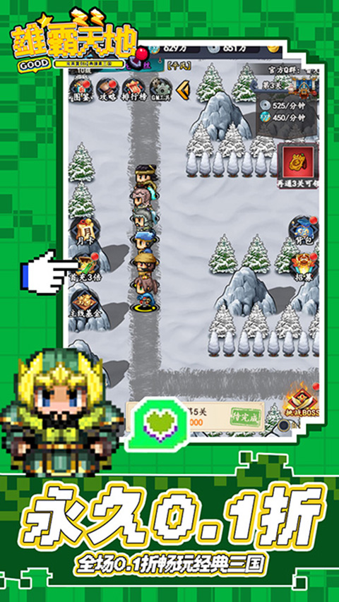 雄霸天地官方版是一款以三国为背景的角色扮演类回合制手游,游戏采用了独特的像素风格,玩家可以从魏、蜀、吴、群四个阵营中任选一个,扮演该势力的主公,你将从多个角度亲身体验恢弘的国战、经典的剧情以及有趣的策略玩法。雄霸天地拥有十分庞大的自由开放地图,在这里你可以带领自己的队伍自由探索野外,收集各种素材道具以及武器等,还可以对收集到的武将进行培养,提升战力,解锁更多强大的技能。除此之外还有丰富的隐藏剧情、宝箱以及各种活动玩法等你来发现。感兴趣的话快来下载体验吧!