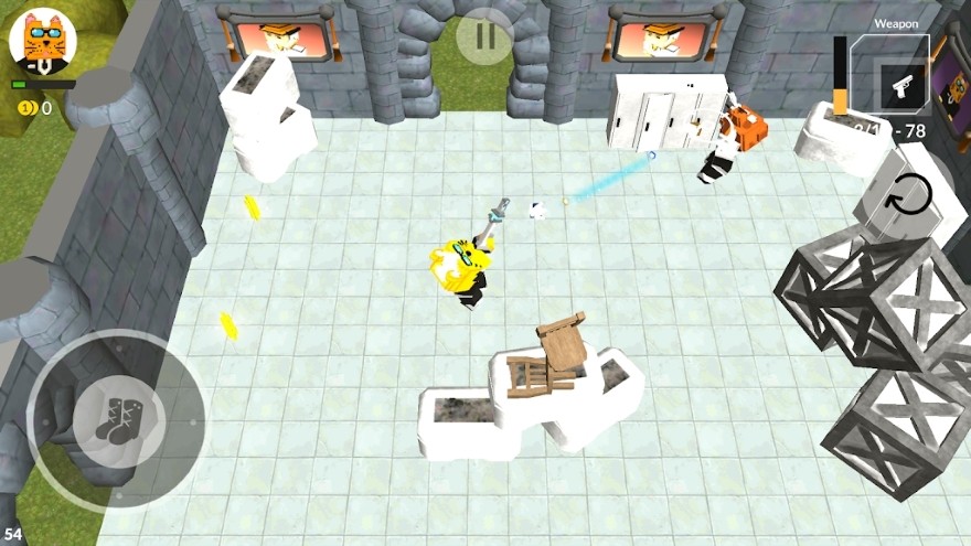 1、猫与狗竞技场射手3D场景内有许多的障碍物能作为掩体,但是要小心可能会被范围伤害给攻击到;
