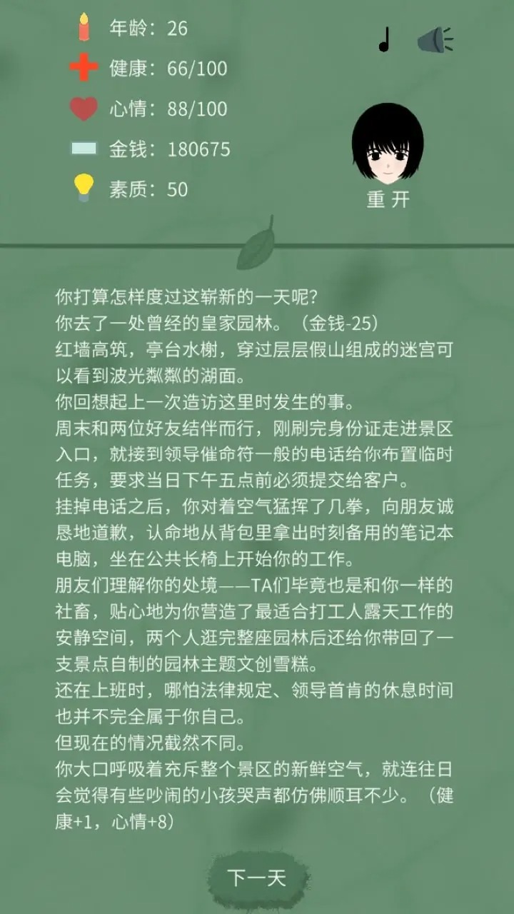 2、游戏中玩家将通过决策来决定自己的生活方向,可以选择创业、旅行、学习新技能,或者重新进入职场,每个选择都会影响故事的发展;