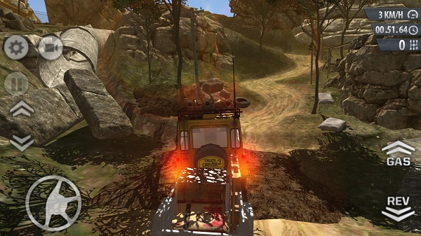 如图所示,玩家正在驾驶一辆重型的卡车并且装满了物品,在泥泞的道路上拼命的挣扎前进,行驶速度非常的缓慢,可见这个路段都卡车和玩家的车技都是一个考验。左下角是卡车的左右转向,右下角分别是刹车和油门踏板,上方红色是卡车的灯光开关,上面是镜头视角切换。