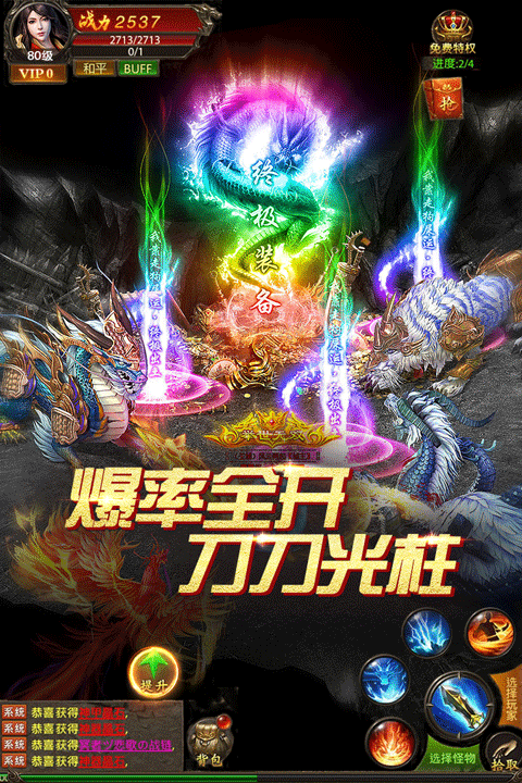 游戏内有十倍爆率和二十倍爆率的boss设定,击杀可掉落相应阶级的神装!