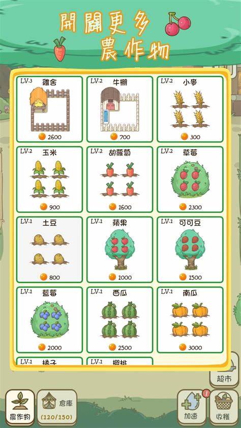 3、用赚取的金币购买更多的土地,解锁先进的农作物和设施。
