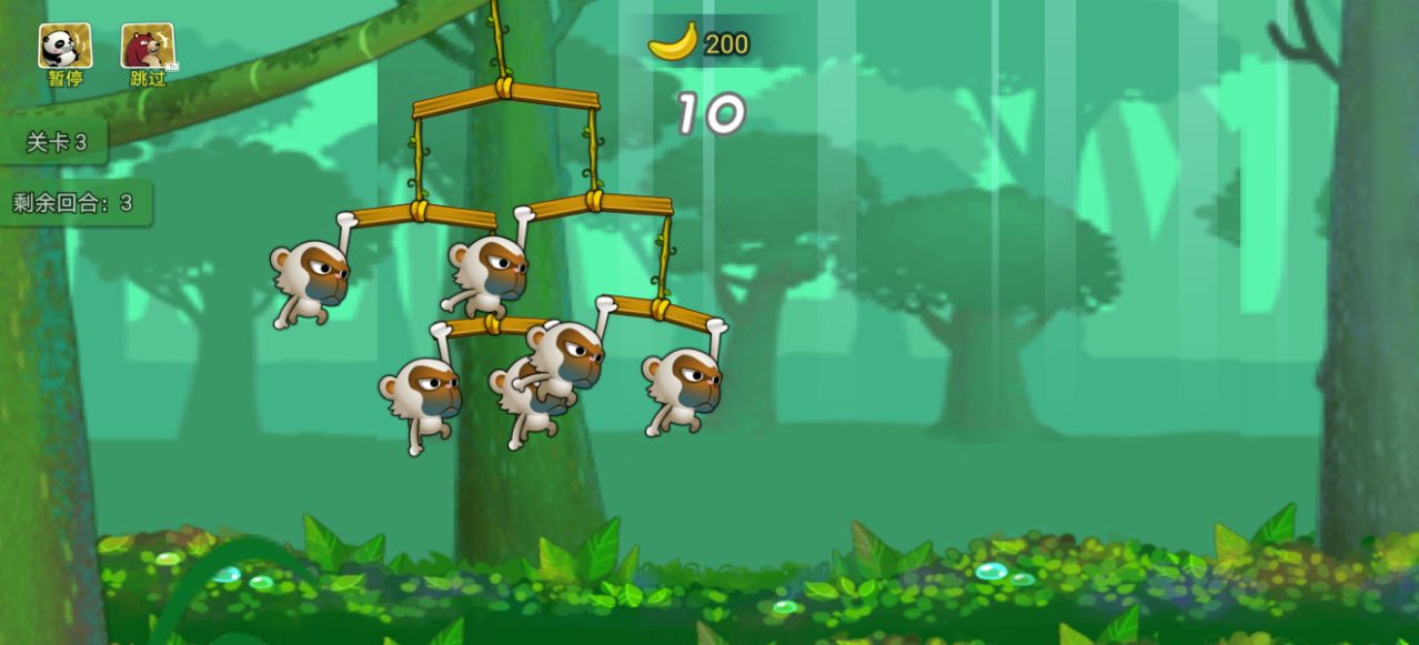 1.操控小猴子进行接力移动,收集指定数量的香蕉,顺利通关.