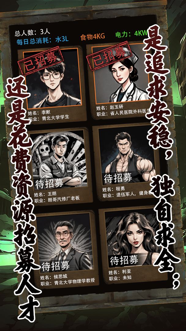 3、招募人员最好均衡招募,两个安保加一个护士加一个科研,安保轮流出去找物资,护士无休加班照顾伤员。