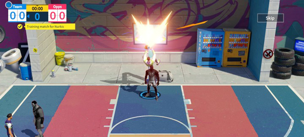 《全明星街球派对》的场地仅占用标准篮球场的一半,攻防转换时,场地上的三分线会闪烁提示,如果不出三分线,则无法进行进攻。