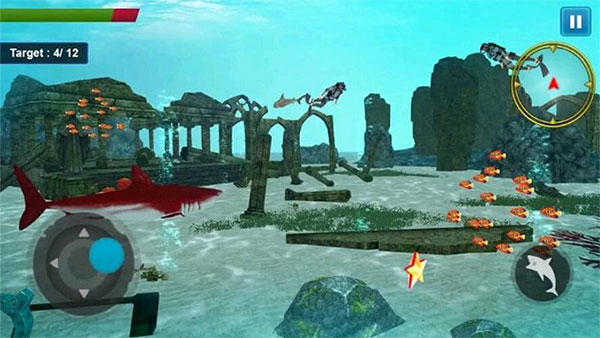 3、进入游戏后,使用左边轮盘控制方向,右边控制上升和下降。在规定的游戏时间内完成游戏任务即可,可以通过左上角的地图来快速发现鱼儿。