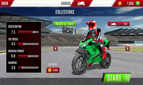 4、允许玩家对自己的摩托车进行个性化定制,包括外观颜色、贴纸、零部件等方面的改装。你可以根据自己的喜好打造出独一无二的专属座驾,展现个性与风格,在赛场上脱颖而出。