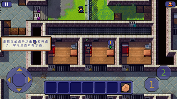 逃脱者1是一款以监狱为题材的冒险解谜逃脱类游戏,采用了经典复古的像素画风打造,提供了丰富多样的地图场景,搭配轻松欢快的背景音乐,给玩家带来了无尽的乐趣和挑战。玩家将扮演身处监狱的环境中一名囚犯,你需要想尽办法,用各种工具和狱警斗智斗勇,最后成功逃离监狱,游戏的操作也很简单易上手,采用了虚拟摇杆加固定按键的方式,使得操作更加便捷和直观。
