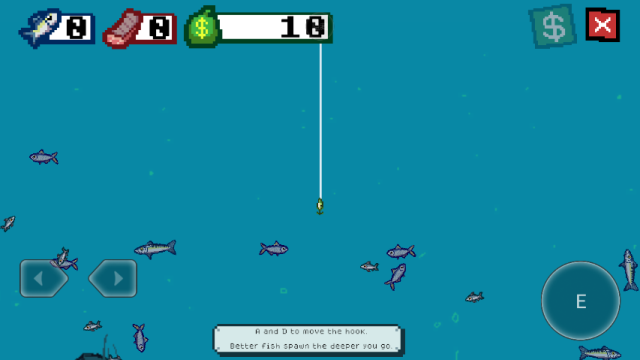 2、前往最左边的钓鱼台,点击E开始钓鱼。钓鱼线会自动下降;使用左右方向键来控制它的方向。用鱼钩撞击一条鱼,对它造成伤害,伤害足够后将它钓上来。