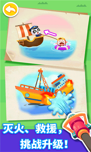 伙伴们掉进水里了,宝宝能帮助它们嘛?扔出救生圈,就能救起它们。看,有船只起火,快使用消防泡沫,扑灭大火。人鱼公主被困,宝宝化身小骑士,剪开海草,解开铁锁,救出公主,宝宝真棒!