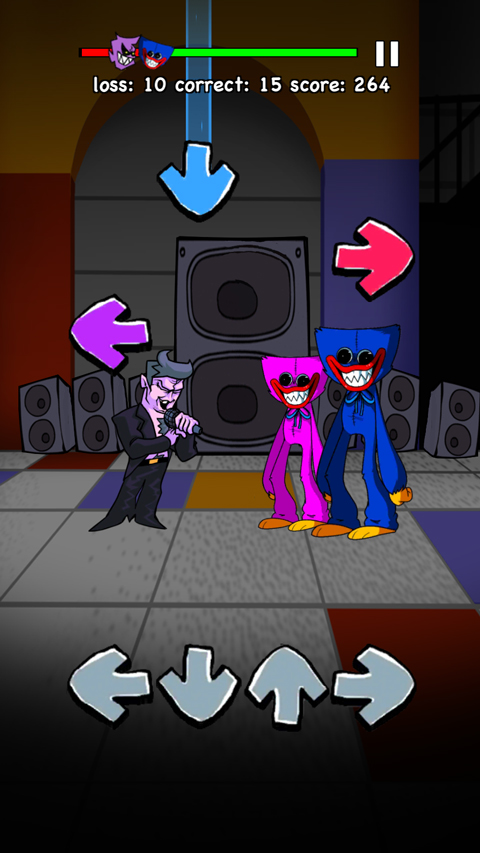 而在玩法上,游戏则采用了竖版点击操作,当音乐对决开始后,屏幕上方下落方向键,玩家需在上方颜色箭头下落至灰色箭头处点击,这样才能得到相应的分数,只要掌握量好的节奏,不停得分,即可通过关卡。