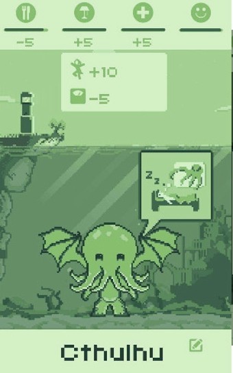 如同其他纯正的虚拟宠物游戏,你同样需要留意克苏鲁宝宝的体重变化。若它过于消瘦,你需要增加喂食,食物包括蜥蜴、鱼类和“见证者”;若它过于肥胖,则需引导它参与游戏活动。游戏分为掷骰子与寻宝地图两种模式。这两种游戏的内容均源自洛夫克拉夫特作品中的远古邪神背景,如掷骰子游戏中可能让克苏鲁宝宝随机破坏城市、引发噩梦,但也存在感染瘟疫病毒的风险,导致其健康度急剧下降。在健康度极度低落时,克苏鲁宝宝将无力进行任何活动,只能迅速接受治疗。