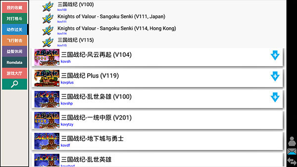 1、运行kawaks街机模拟器手机版后如下图所示,包含了对打格斗、动作过关、飞行射击、益智休闲等;