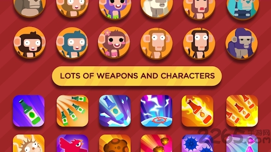 进击的猴子游戏中的玩法有趣,操作简单,灵活的控制游戏中的猴子来开始各种各样的攻击,快来消灭游戏中的敌人来开始你的战斗,瞄准你的敌人开始一场有趣的进攻吧。抛掷各种各样的武器来攻击你的对手,游戏中的武器丰富多样,超乎你的想象,使用能用的一切来开始你的战斗。卡通风格类的竞技游戏,在这里控制游戏中的猴子来开始一场有趣的战斗