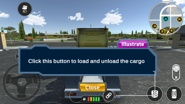 2、游戏以第一人称视角的形式表现,利用左下角方向盘操作转向,右侧则是各种功能按键;
