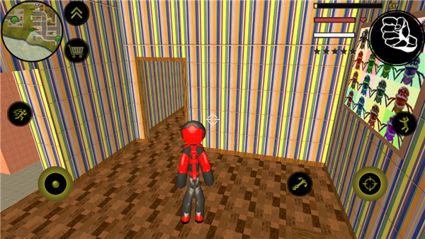 左侧移动、加速,右侧绳索,攻击(跳跃),跳跃,右上侧的武器更换以及血量、经验的显示都实时更新,一览无遗,凭借着大家自由的玩法,与其他帮派的人物进行交火,期间杀人能够获得经验,杀多了会产生星级,警察和其他附近角色会特殊照顾你对你展开火热的进攻,而如何存活,如何将其他人物击杀则是你所需要完成的任务。
