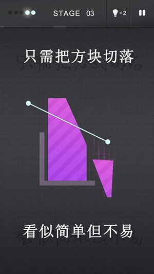 通过点击和滑动手机屏幕切割方块,切落超过80%以上即可过关。