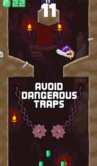 点击可以伸缩墙壁,碰到墙壁会反弹。画面内有着许多的粉色尖刺,若老人被它们刺到则会扑街。所以利用墙壁的弹性,躲避开这些尖刺,另外还可以收集绿色的小水晶,以获得更多奖励。