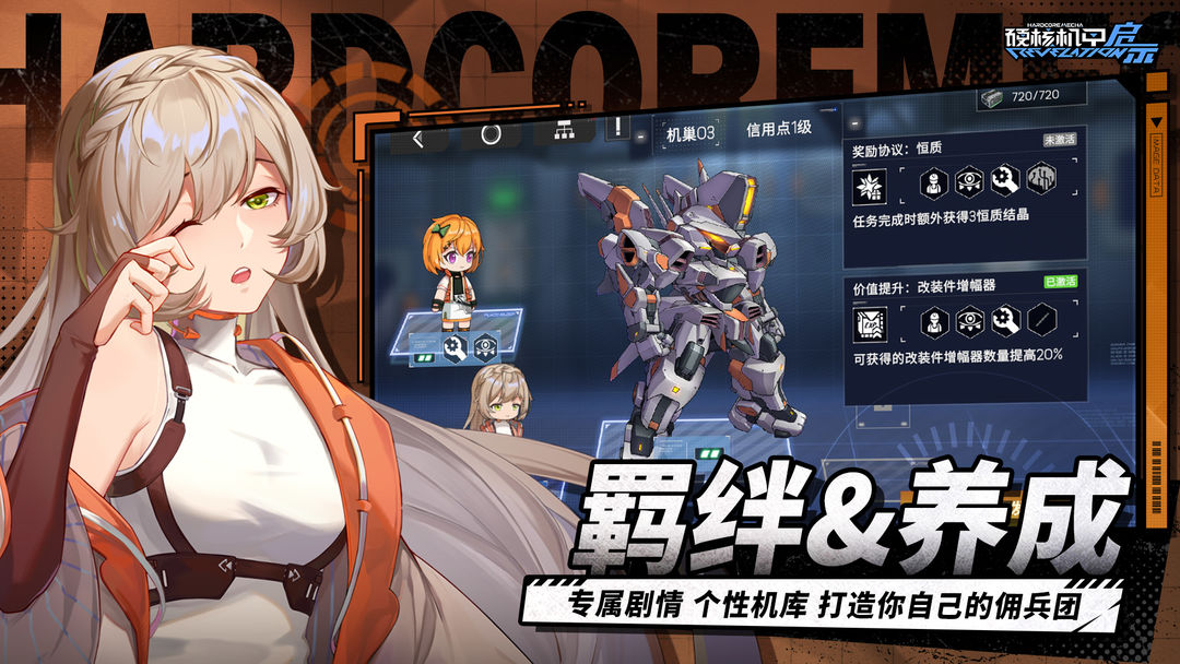 硬核机甲启示是一款ARPG的机甲科幻手游。游戏采用2D科幻画风,精致的机甲模型,带来极佳的视觉体验。玩家进入游戏后,将成为一名指挥官,通过自己的私人武装公司,创造出众多强大的美少女机甲英雄,与火星殖民圈的所有势力展开激烈战斗,逐步消灭动荡的势力,解锁隐藏的故事真相,保护世界和平。在游戏中,玩家可以体验自己操纵机甲的快感,感受机甲之间合作的战斗快感,沉浸在科幻机甲的世界中。感兴趣的玩家们,快来下载游玩吧!
