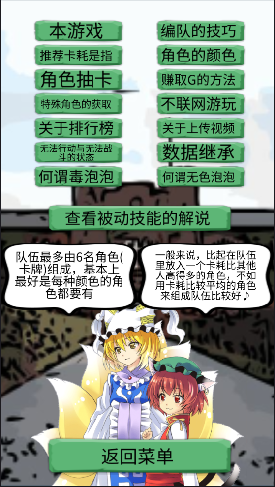 1、角色介绍中只汉化了名字,简介没有汉化,一来本作没有剧情,是个纯消消乐游戏,二来东方厨的话不需要看简介、非东方厨不知道角色的来历也不影响闯关。