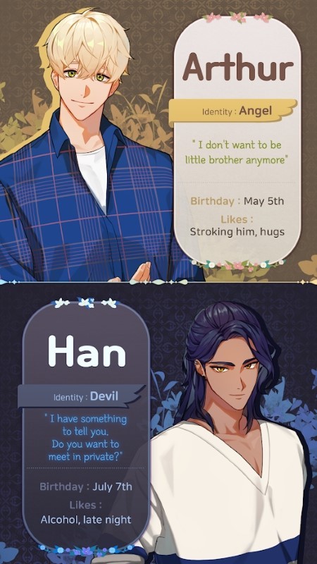 一条可疑的线索改变了你的命运,你发现自己生活在 “天使 ”和 “恶魔 ”之间。为了拯救你的命运,你需要找到恶魔。游戏提供了许多惊险刺激的奇妙选择、新的故事分支和结局。如果您喜欢浪漫、神秘和危险的爱情故事,喜欢接触迷人的角色。