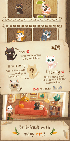 只有当你把你的房子装饰得更好、更舒适时,你才能让更多的小猫喜欢你。每一只猫咪都能带给玩家不同的乐趣。
