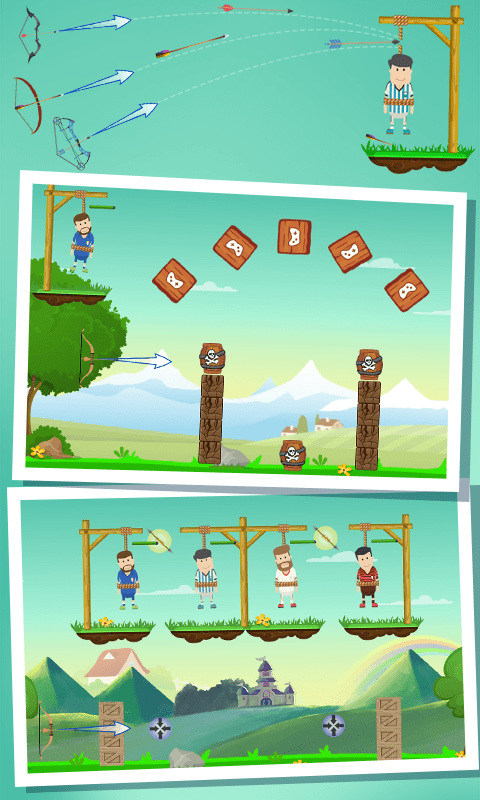 作为弓箭手们中的一员,您必须使用弓箭,小心地准确的射击绑住人们的绳子,还不可以射到到上面的人。射断绳子就可拯救人们。游戏中有多种形式的道具和传送,帮助弓箭手们完成拯救。快加入拯救弓箭手大作战的阵营中,成为最强射箭达人。