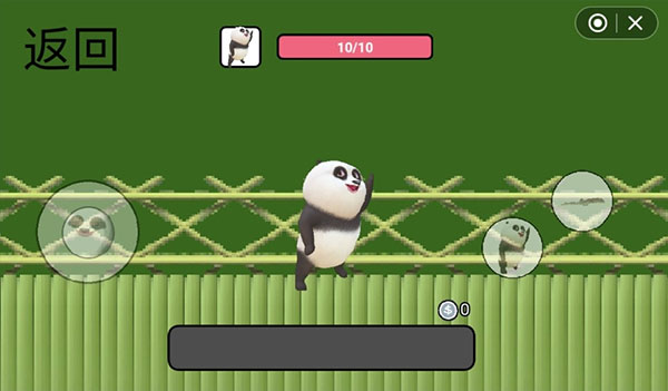 6、可以看到左下角可以控制主角国宝熊猫进行移动,顶部是当前角色的血量,右侧分别是跳跃和武器,由于小编刚开始玩,还没有获得金币,没钱购买武器,所以暂时不能使用。