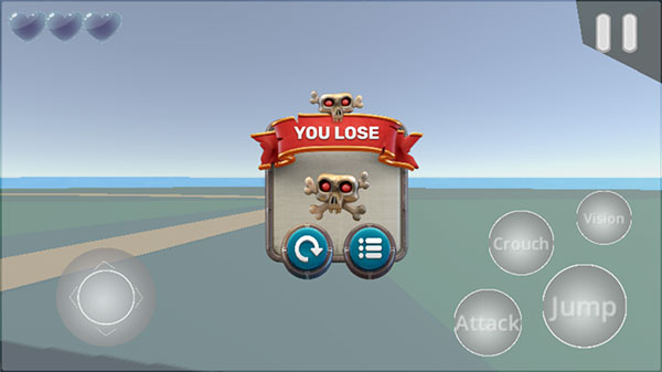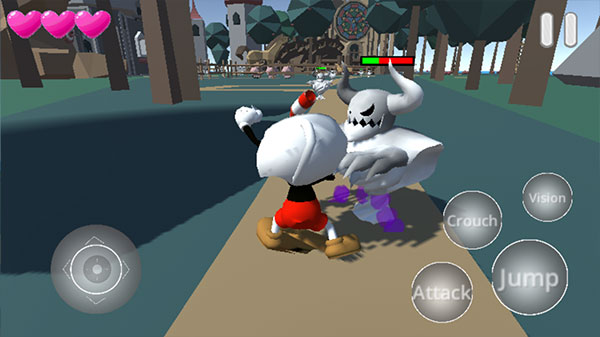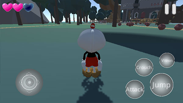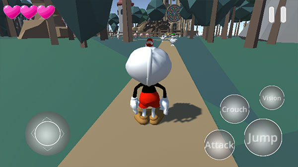 2、左下角按钮控制茶杯头自由移动,右侧分别是Crouch弯腰潜行,Vision切换视角,Attack进攻以及Jump跳跃等四个基本动作。