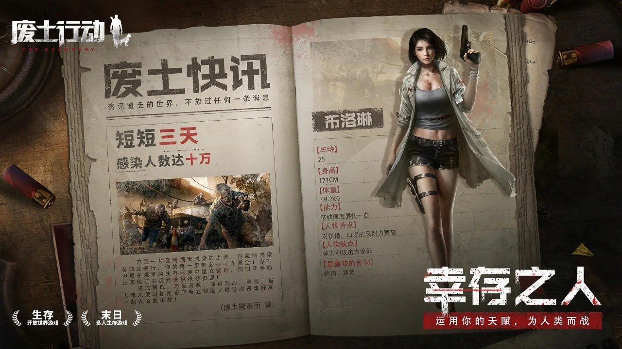 废土行动是一款在末日废土世界观下展开的生存类手游。玩家将扮演一位幸存者,在一片被病毒摧残的废土世界中努力生存下去。这款游戏以其独特的设定和玩法,吸引了众多玩家的关注和喜爱。玩家将扮演一位在废土世界中挣扎求生的幸存者。游戏开始时,玩家会随机获得一个生存者角色,每个角色都有自己独特的技能和特点。在游戏中,玩家需要不断地收集资源、建立营地、防御感染者和其他玩家的攻击,同时也要与其他玩家争夺资源,扩大自己的生存空间。