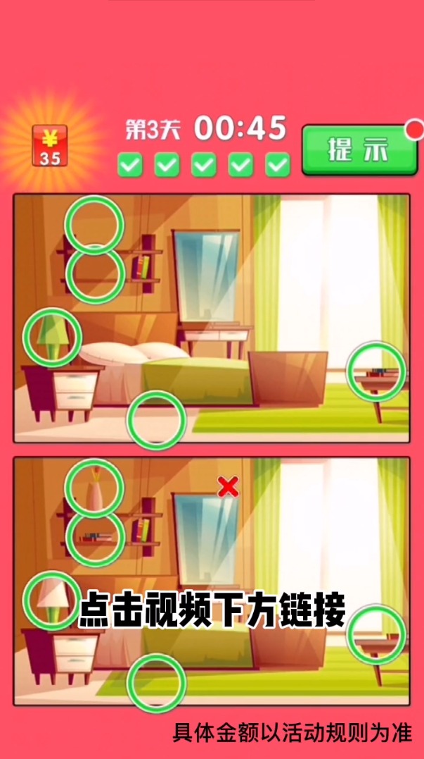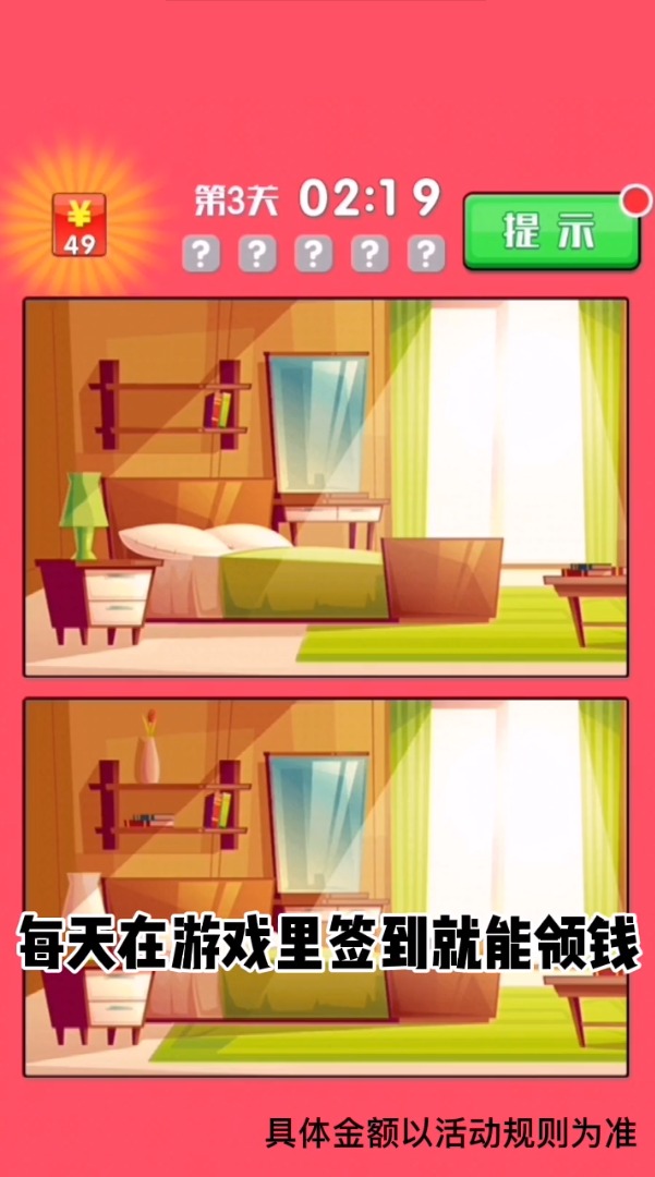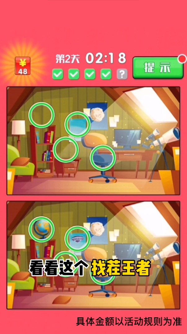 这里有很多的关卡,找出这两幅画的区别,你可以很容易地得到丰富的红包和大量的惊喜,然后你可以随时在线玩,通关后,你可以获得更多好处,收集道具,轻松过关。