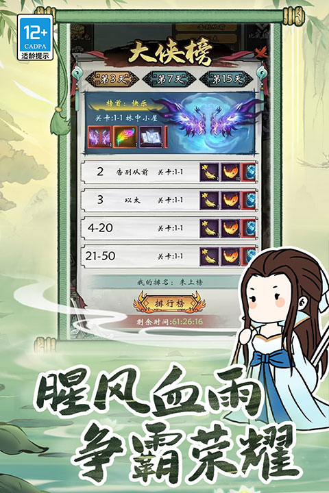2.大侠榜(关卡榜单3/7/15),修改了翅膀皮肤双条件激活;