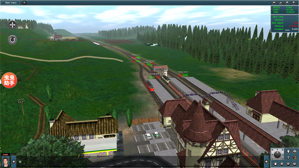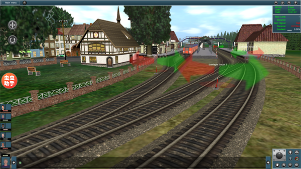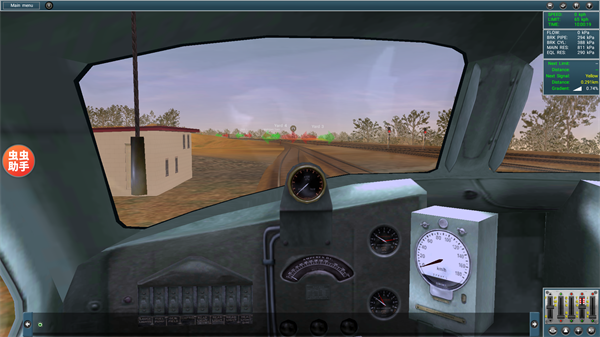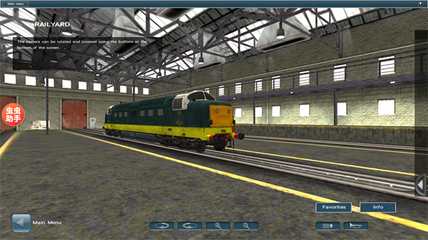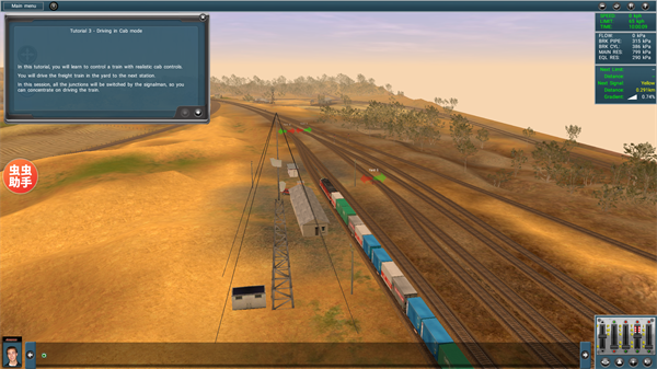 1、首先在本站下载并打开TRS12火车模拟器,进入主页后你可以看到5个不同的选项,分别是教程、路线、存档、模型广场以及额外内容,同时在屏幕左侧还可以看到“虫虫助手”按钮。