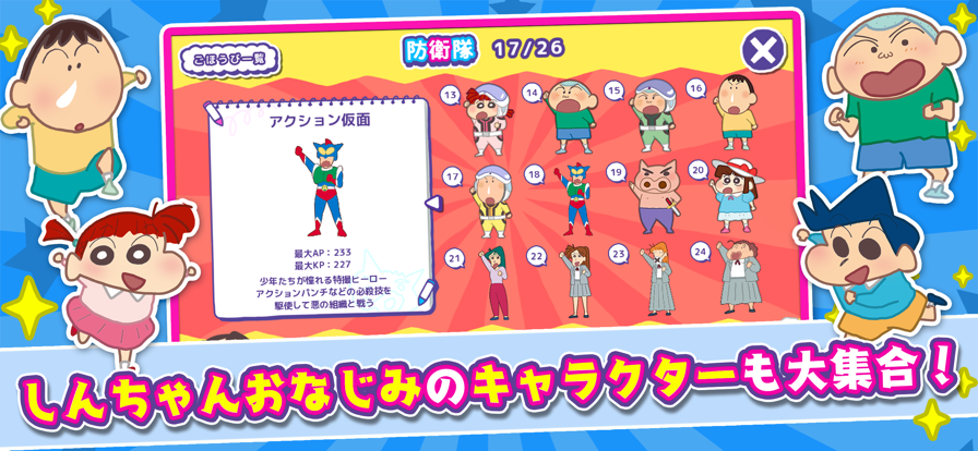 丰富的角色互动:玩家不仅可以招募蜡笔小新系列中的经典角色加入自己的春日部落,还能与他们进行有趣的互动,增加游戏的趣味性和代入感。