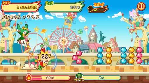 在这款游戏裡四处遍佈著美味的点心,据说这是由神秘UFO搞的恶作剧。本作玩法是操控小新在疾跑疾跑,男女老少都可以轻鬆游玩的游戏。点击可爱的小新就可以跳起避过障碍物,收集糖果和追逐UFO。每次游戏结束后,系统会自动根据分数来计算奖牌。完成一回合游戏后所得分数和奖章会加算,玩家可以此换取物品和衣装,附有各式各样效果影响回合得分。当然了除了小新之外,动画片裡的其他小伙伴们也会逐一出场。春日幼稚园的风间君、妮妮等朋友如果跟著小新一起跑的话,会產生意想不到的好效果哦,比如进一步提高分数等等。