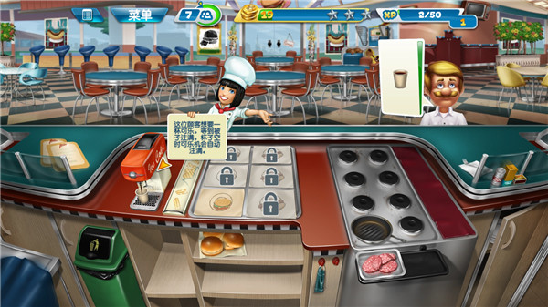 3、随着玩家不断解锁关卡,会得到更多新的食材和道具,也会越来越手忙脚乱。这里小编有一个小技巧分享给大家,很多客人会选择点套餐,而套餐中只要上了一个食物就可以增加顾客的等待时间,因此可以常备一些饮品,用于增加顾客的等待时间。