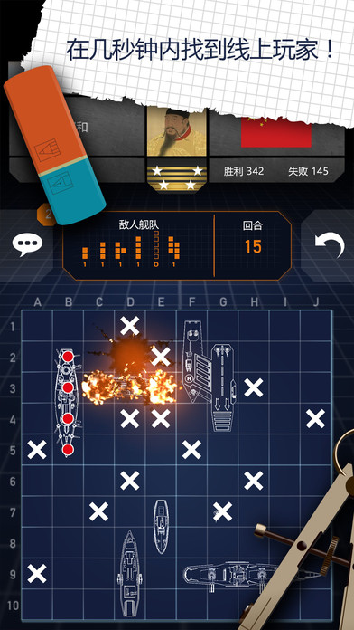 3、需要注意的是战斗中所有舰船是不可见的,需要玩家去猜测和推理对方的战舰在哪里。