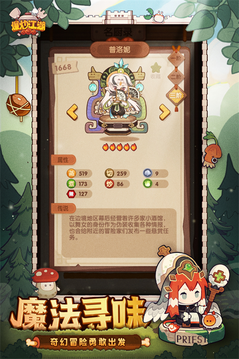 游戏中里的厨师技能丰富,不仅会采集食材、烧菜,在烧菜时还可以和你唠唠嗑,让你在干游戏时不会孤单,提高厨师的技能,就需要给厨师升级和进化,厨师进化到二阶时会获得一个技能,厨师进化到三阶时可以装备一个厨具,这样厨师的做法技法提高,客户的满意度也会提升。