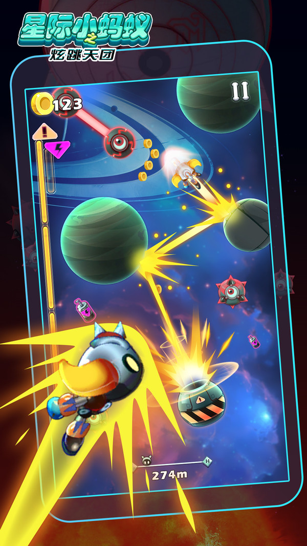 2、控制各种各样的有趣的卡通人物探索宇宙,感受这个奇异的游戏场景;