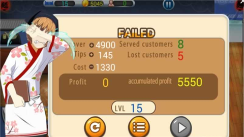 4、运营好餐厅,如果你不能服务好客人,获得相应的报酬,那么就无法进入下一关进行挑战哦。